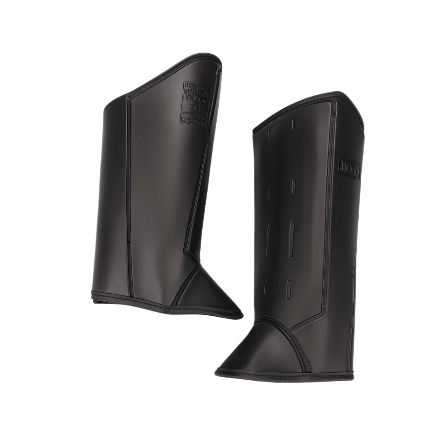 Perneira segurança em couro Bidim 3 Lâminas, Standart com Velcro – preta, confeccionada em laminado de PVC expandido sobre manta de poliéster, três haste de plástico, fechamento em velcro sendo duas fêmeas e um macho.